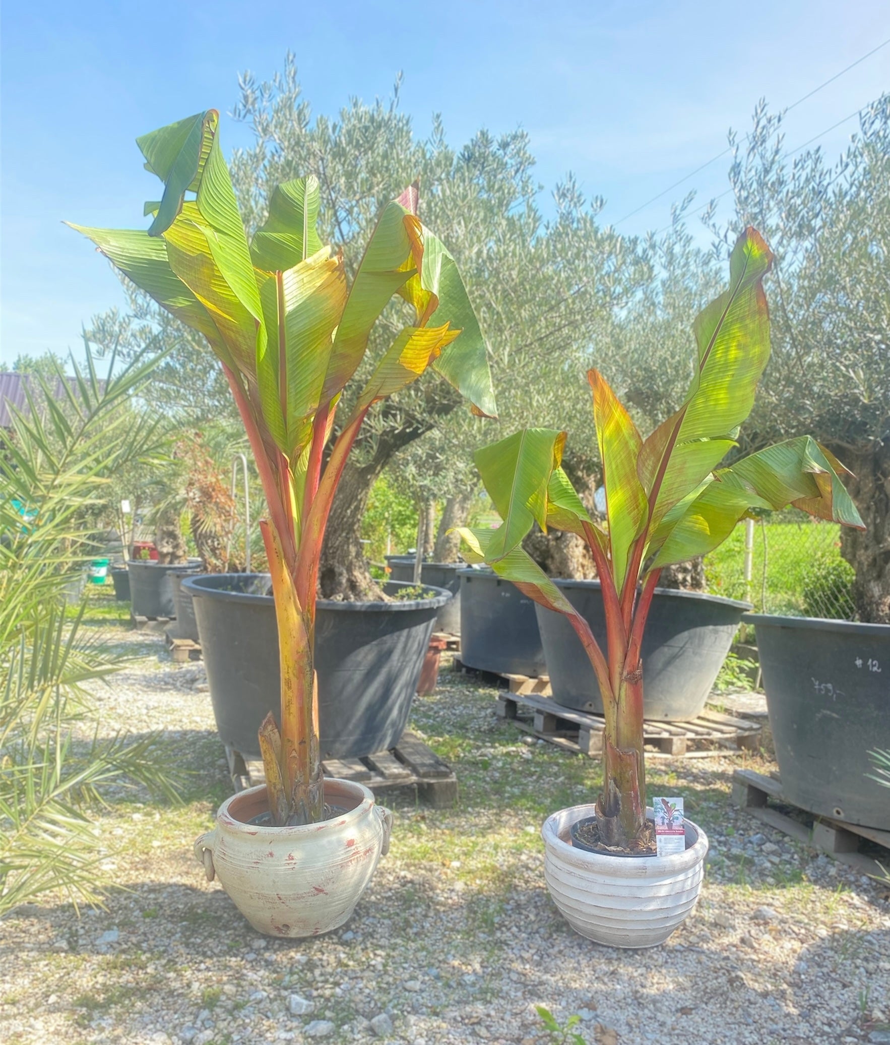 Exotická dominanta pre vašu záhradu, terasu či interiér! Banánovník Ensete maurelii zaujme obrovskými zeleno-červenými listami, ktoré okamžite vytvoria tropickú atmosféru. Rastie veľmi rýchlo – pri vhodných podmienkach dorastie až do výšky 3–4 metre v priebehu 3–5 rokov.